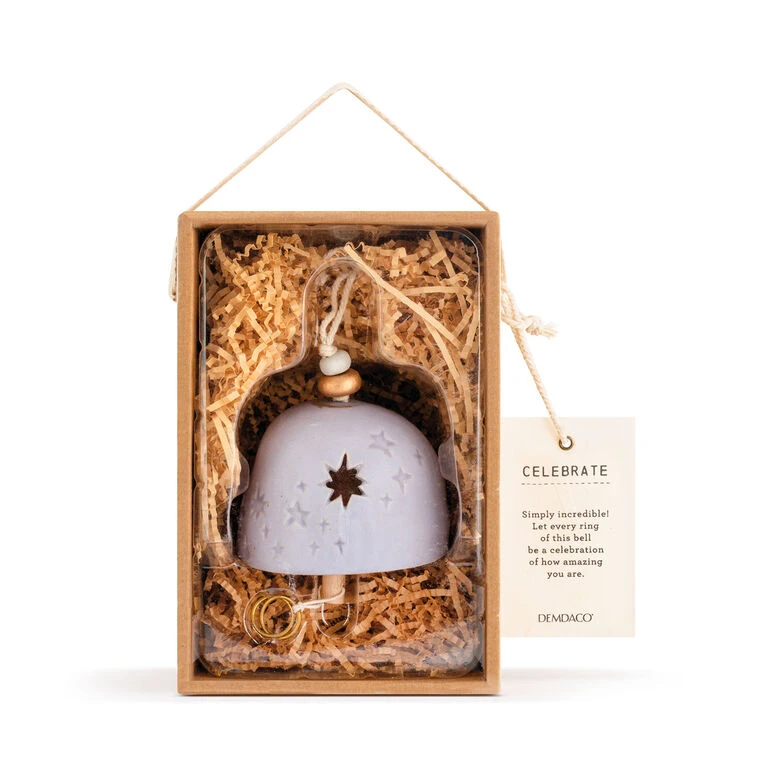 - Demdaco handcrafted stoneware bell features a star-shaped cutout and twine cord hanger.