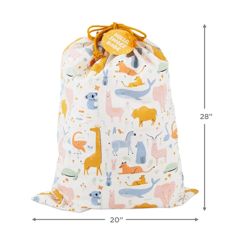 Celebrate a baby on the way or a little one’s big day with this fun fabric gift bag. Perfect for large or hard-to-wrap items, this canvas sack gift bag features sweet pastel illustrations of creatures great and small—from bunnies to whales and everything in between. A coordinating gift tag and easy cinch-closure means the perfect baby gift presentation is in the bag. Hallmark jumbo fabric gift sacks are reusable and perfect for large or hard-to-wrap gifts.