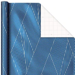 • Pack includes 2 standard wrapping paper rolls (layered blue stripes and gold dots on cream) plus 1 holographic roll with metallic gold accents (snowflakes on teal).